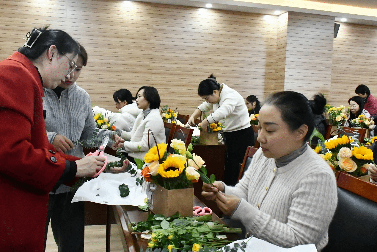 插花师为女教职工们讲述了插花的原则、流程以及技巧,并启发大家发挥想象力和创造力,创作出有个性的作品。现场的女教师们纷纷拿起剪刀,选择自己喜欢的花,自行设计并进行创意插花。经过不断尝试和实践,一盆盆生机盎然、创意十足的插花作品呈现在大家眼前,令人赏心悦目。老师们纷纷拍照、发朋友圈,激动不已。