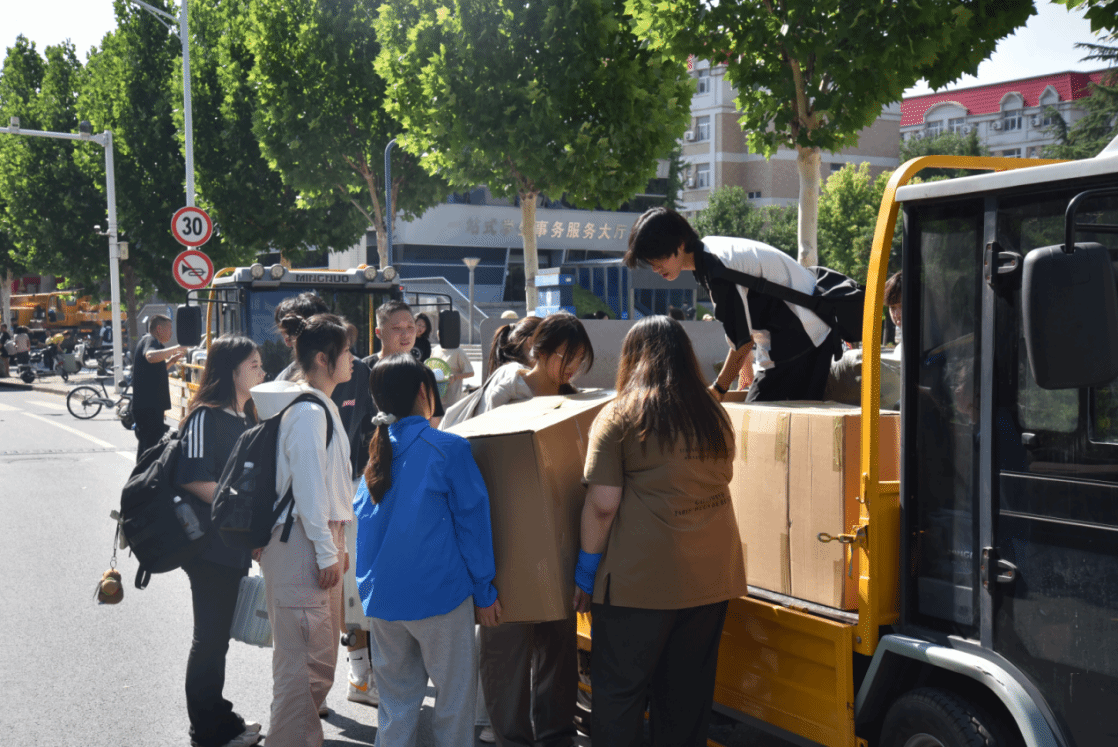 在学校各个工作组的协调与帮助下,志愿者们迅速行动起来。他们身着马甲,分工明确、有条不紊地投入到帮助学生搬运行李的工作中。“红马甲”穿梭在盛夏的校园里,成为一道靓丽的风景线。