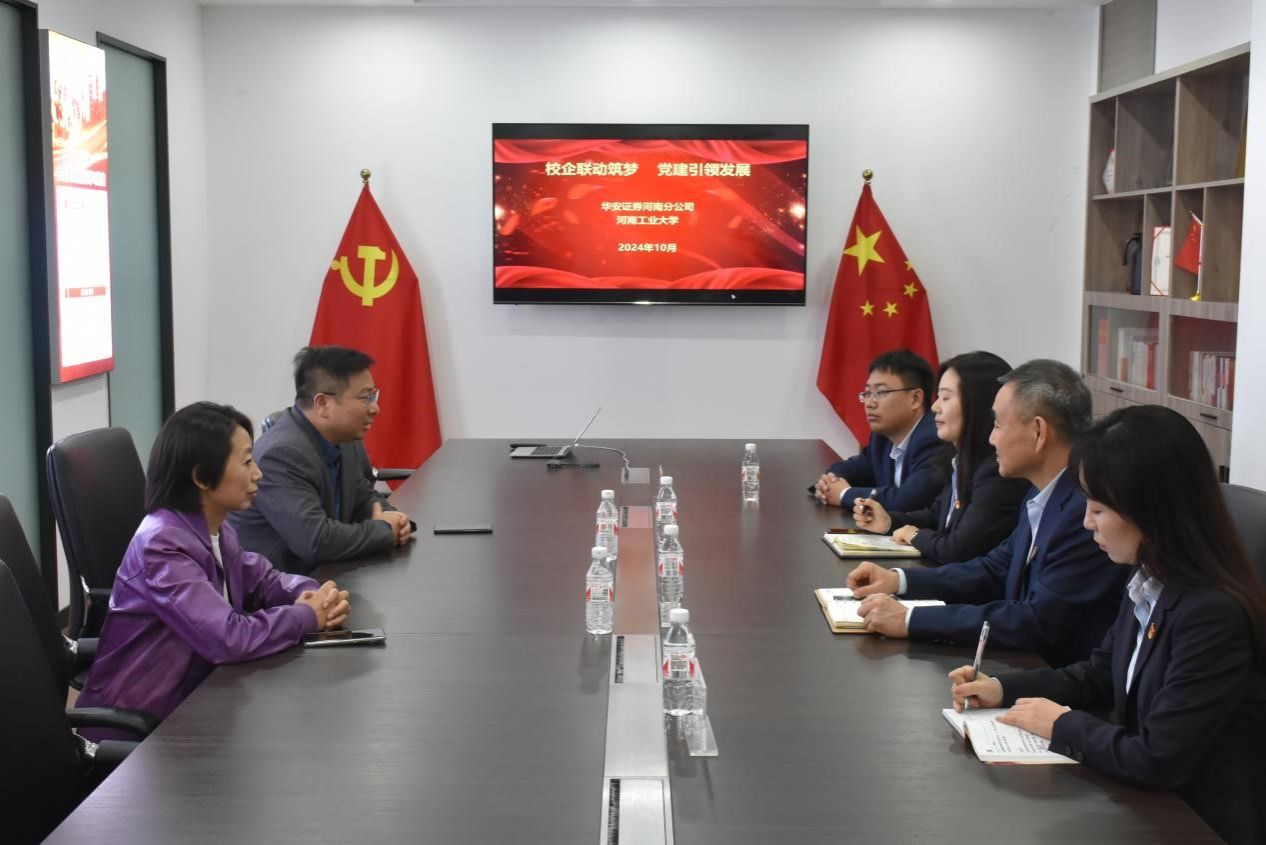10月22日下午,经贸国产av金融系党支部书记刘变叶、实验室主任吴成浩等师生一行前往国产av产学研实践教学基地华安证券河南分公司进行实地调研。华安证券河南分公司第二党支部支部书记、商都路营业部总经理许鲁南,党总支组织委员桑晓青,第二支部组宣委员李静茹、商都路营业部团队主管党晓占一行热情接待并参加了会议。